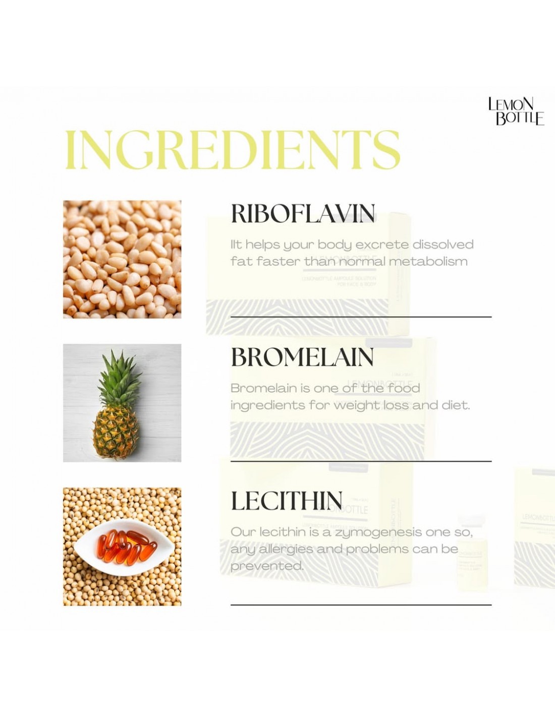 Apă, extract din fructe de Ananas Sativus (Ananas), Pentilen Glicol, Bromelaină, Clorură de Sodiu, Lecitină, Extract de Centella Asiatica, Extract de rădăcină de Salvia Miltiorriza, Extract de Chamomilla Recutita (Matricaria), Extract de rădăcină de Scutellaria Baicalensis, Riboflavină.
